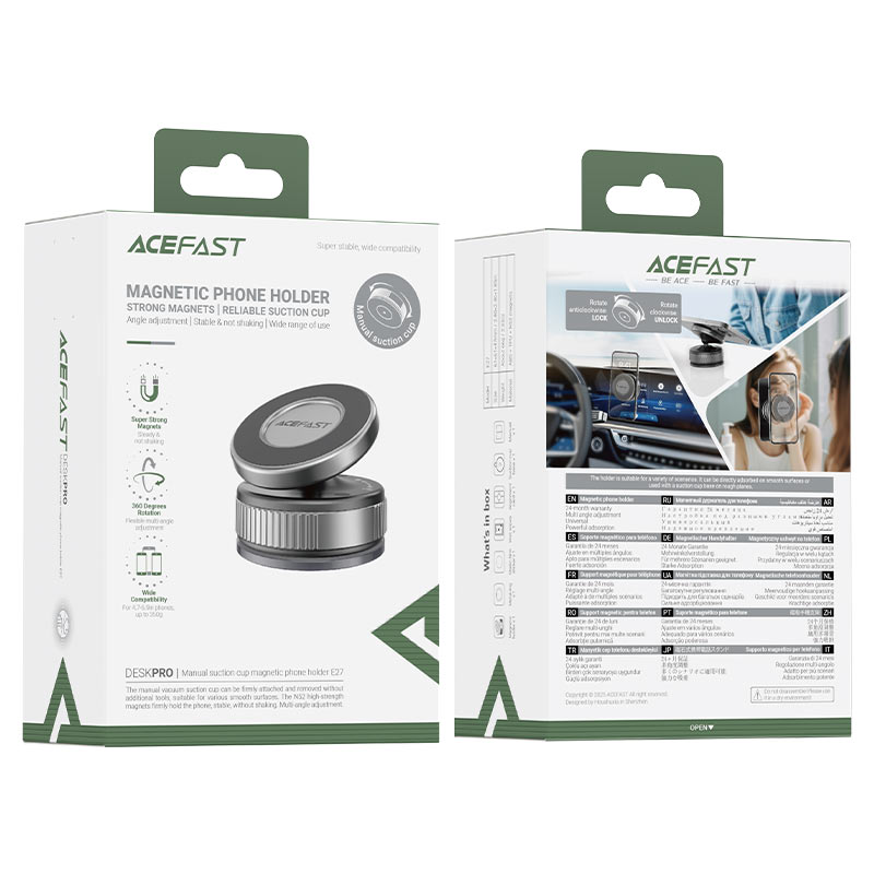 حامل هاتف Acefast E27 باللون الرمادي المعدني، مزود بمغناطيسات قوية لتثبيت الهاتف بإحكام أثناء القيادة. تصميمه العملي يتيح الوصول السريع للهاتف لمتابعة المكالمات أو الخرائط بأمان، مع ثبات عالي يناسب جميع السيارات.