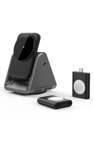 يتميز بتصميم 3‑في‑1 يدعم الشحن اللاسلكي المغناطيسي لهواتف iPhone (سلسلة 12–15)، بالإضافة إلى شحن Apple Watch والسماعات اللاسلكية المدعومة